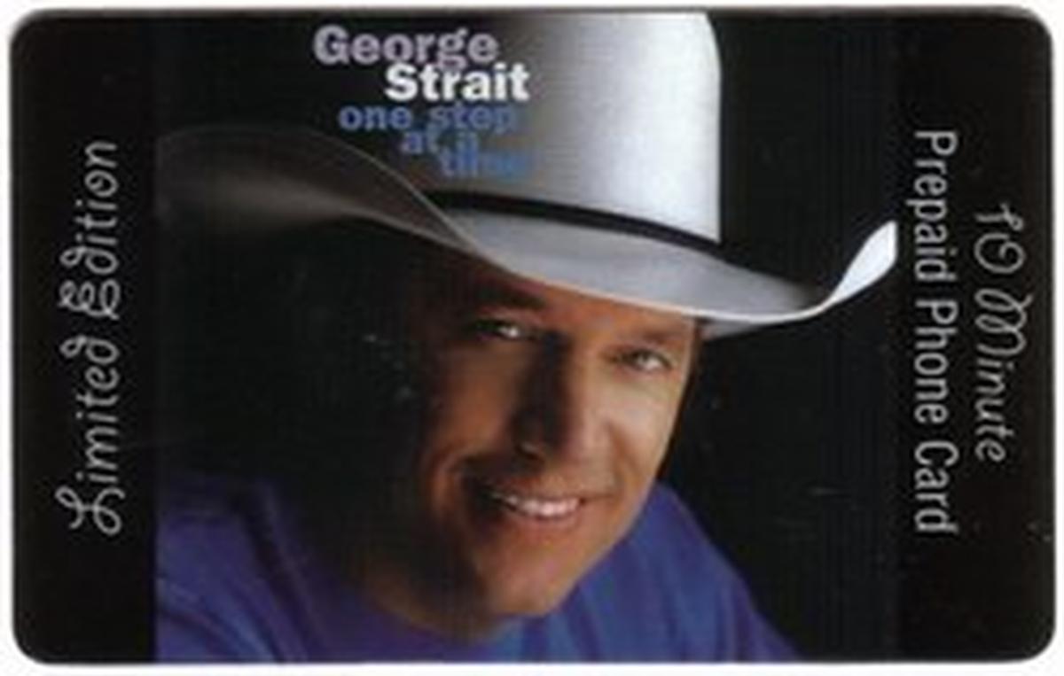 This collectible phone card features a closeup image of country music artist George Strait. The photograph captures George Strait wearing a cowboy hat and a collared shirt, with a focused facial expression. The card highlights the country music genre and the name "George Strait" appears clearly, linking the image directly to the legendary singer.