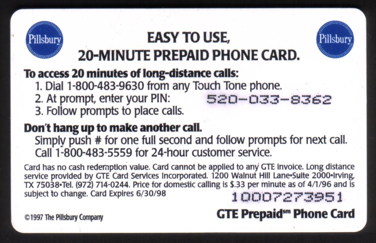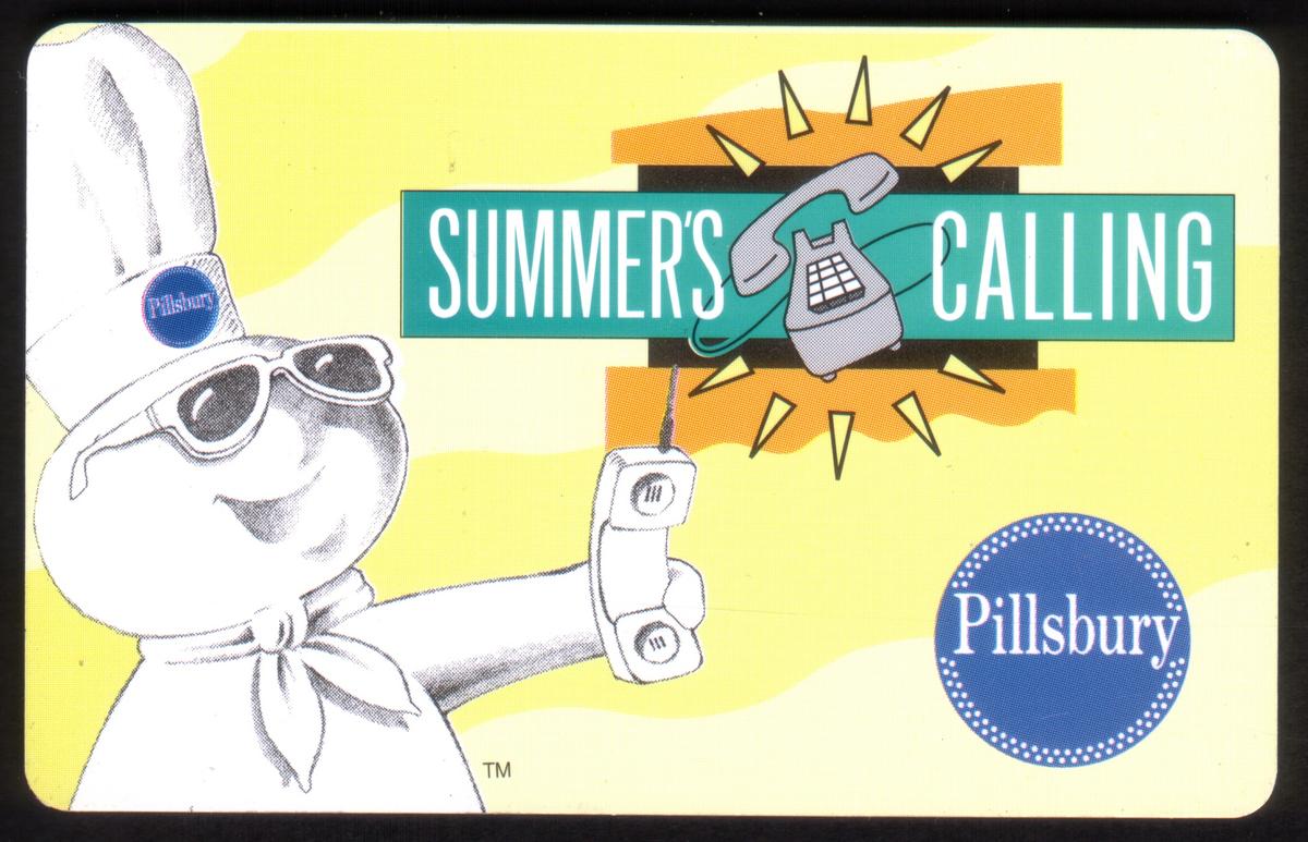 This phone card dates from 1997 and is associated with GTE Card Services. The design highlights a summer theme combined with Pillsbury’s iconic mascot and telephony imagery.