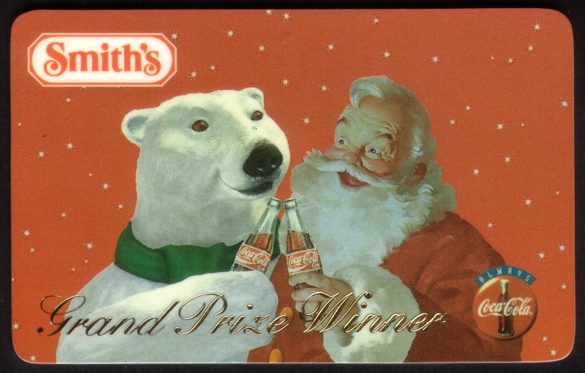 This card emphasizes classic Coca-Cola Christmas imagery with Santa Claus, polar bears, and the iconic branded bottles, highlighting the holiday spirit and Coca-Cola’s advertising legacy. The card is associated with the 1994 Smith’s Coke promotion featuring Santa and the bear toasting Coca-Cola, created by TekTel Marketing Inc.