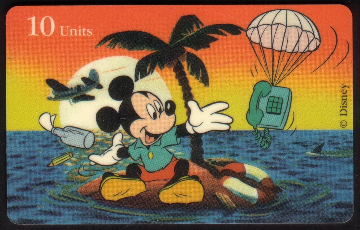 The second card shows Mickey Mouse stranded on a small tropical island with a palm tree, water surrounding him, and a flying airplane in the background. Mickey reaches toward a green telephone descending from the sky under a parachute, symbolizing a call for help. The setting includes a sunset with a gradient of yellow to orange sky, with a shark fin visible in the water.
