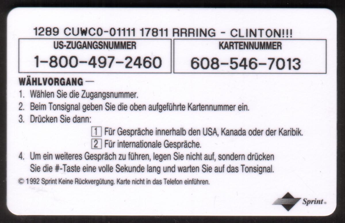 The card is marked with "10 UNITS" at the top left corner, indicating its calling credit. The phone card was issued by Sprint and dates from 1992. This item is part of political satire artwork involving politics and German conservative themes. The imagery combines telephones and wine bottles as symbolic elements alongside the political figure, emphasizing satire in a comic strip or cartoon style.