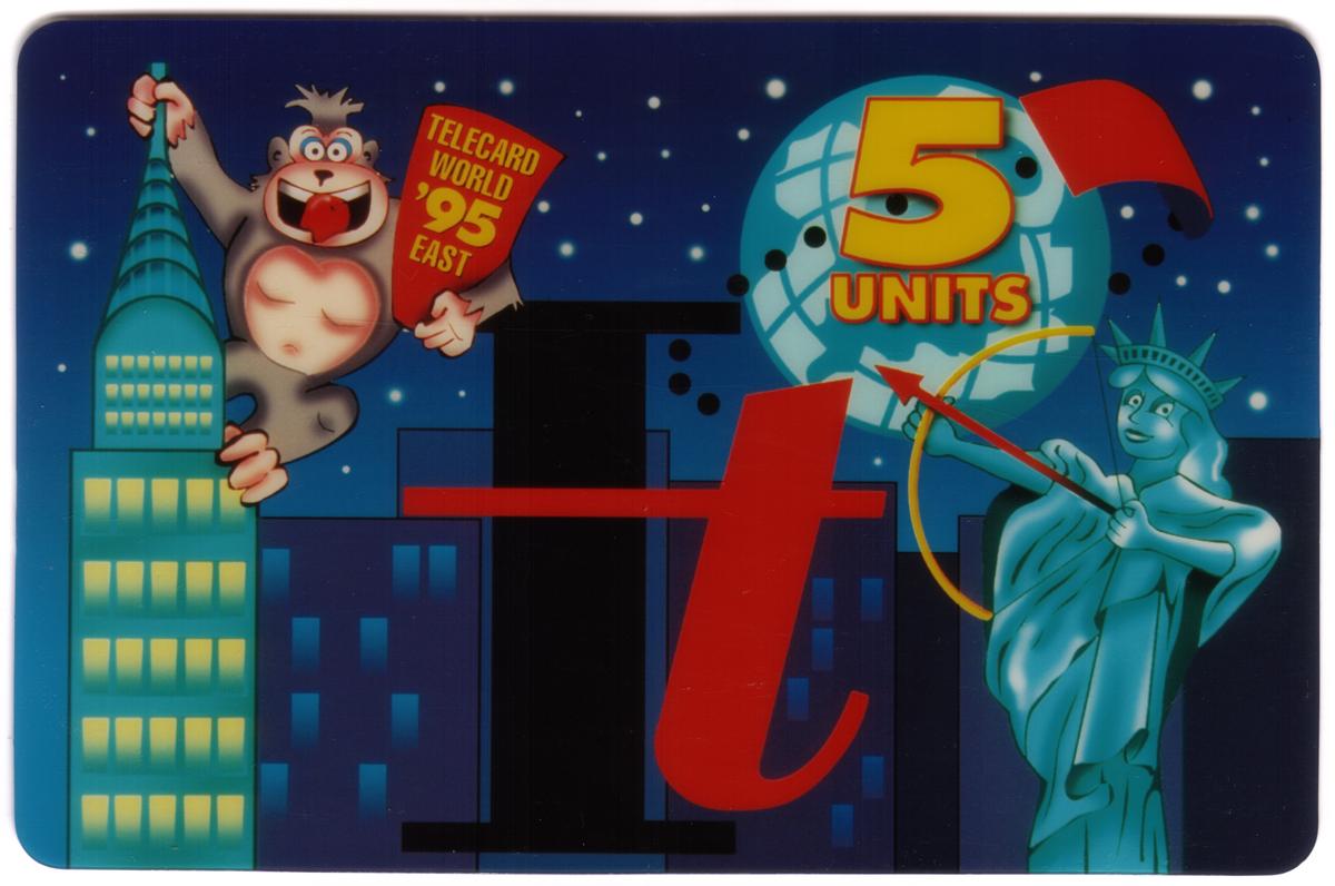 This collectible phone card features prominent New York City landmarks and iconic imagery. The central artwork includes the Statue of Liberty prominently positioned in the foreground. In the background, the Empire State Building is visible, emphasizing the cityscape of New York City, NY. The card’s design incorporates imagery related to “World ’95 East” and includes a depiction of King Kong, which appears to be climbing or perched near the Empire State Building, referencing the classic film association with this location.