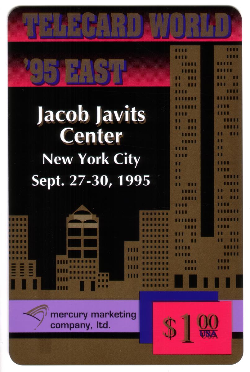 Bold text includes "Telecard World '95 East" and the event location "Jacob Javitz Center" printed near the bottom of the card. The card bears a $1 value and is marked with "Telecard Events" along the top, showcasing its purpose as a promotional piece tied to the phone card industry’s international expo that year. Additional text on the card includes "Mercury Marketing," referencing the marketing firm involved, and "WorldCom," displayed in stylized form on the right side near the Twin Towers.
