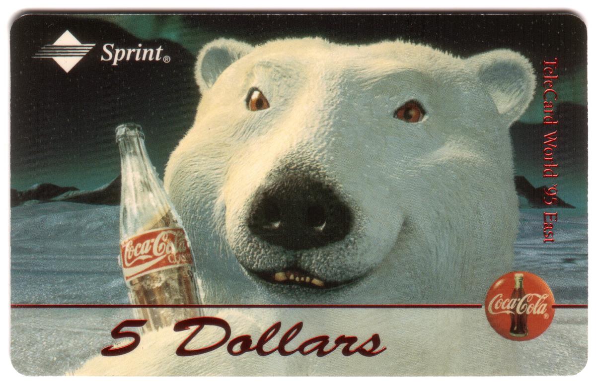 This collectible phone card features a close-up image of a polar bear holding a Coca-Cola bottle in its left paw. The polar bear's fur is white and detailed, contrasting against the dark, icy background which suggests a snowy or frozen landscape at night. The Coca-Cola bottle is a classic glass design with the red and white Coca-Cola logo clearly visible on the label.