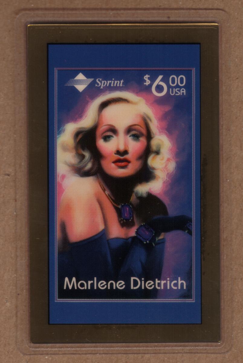 Limited edition Marlene Dietrich prepaid card featuring Tina Watts artwork, gold accents, and a $6 value, blending Hollywood glamour with collectible artistry. |