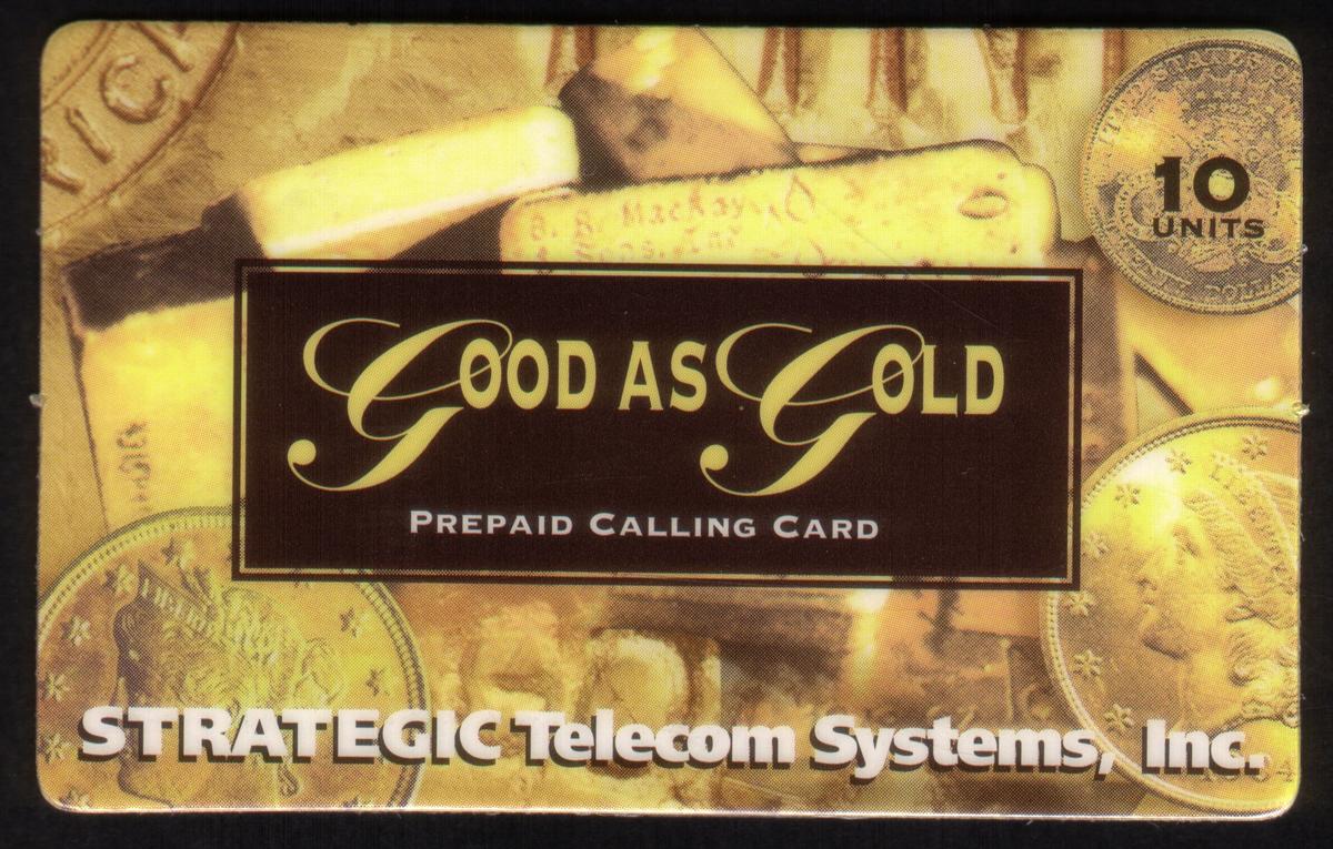 The card includes branding and references to Cable & Wireless, marked by the phrase "10u 'Good As Gold' Pictures Gold Coins And Gold Bars (C&W) - Strategic Telecom Sys." This indicates the card’s association with the telecommunications company Cable & Wireless and its usage as a phone card with a value of 10 units. The words "Strategic Telecom Sys." are also included, connecting to the technical issuer or partner of the card.