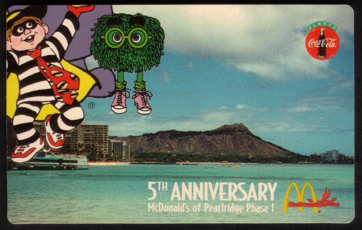 This collectible phone card features iconic characters from McDonald's, specifically Fry Guys and the Hamburglar, set against a backdrop highlighting the Hawaiian Islands. The card celebrates the 5th Anniversary of the McDonald’s location at Pearlridge, Hawaii, evident from the text and imagery present. The artwork incorporates the classic McDonald's Golden Arches logo prominently, reinforcing the connection to the worldwide fast-food chain.