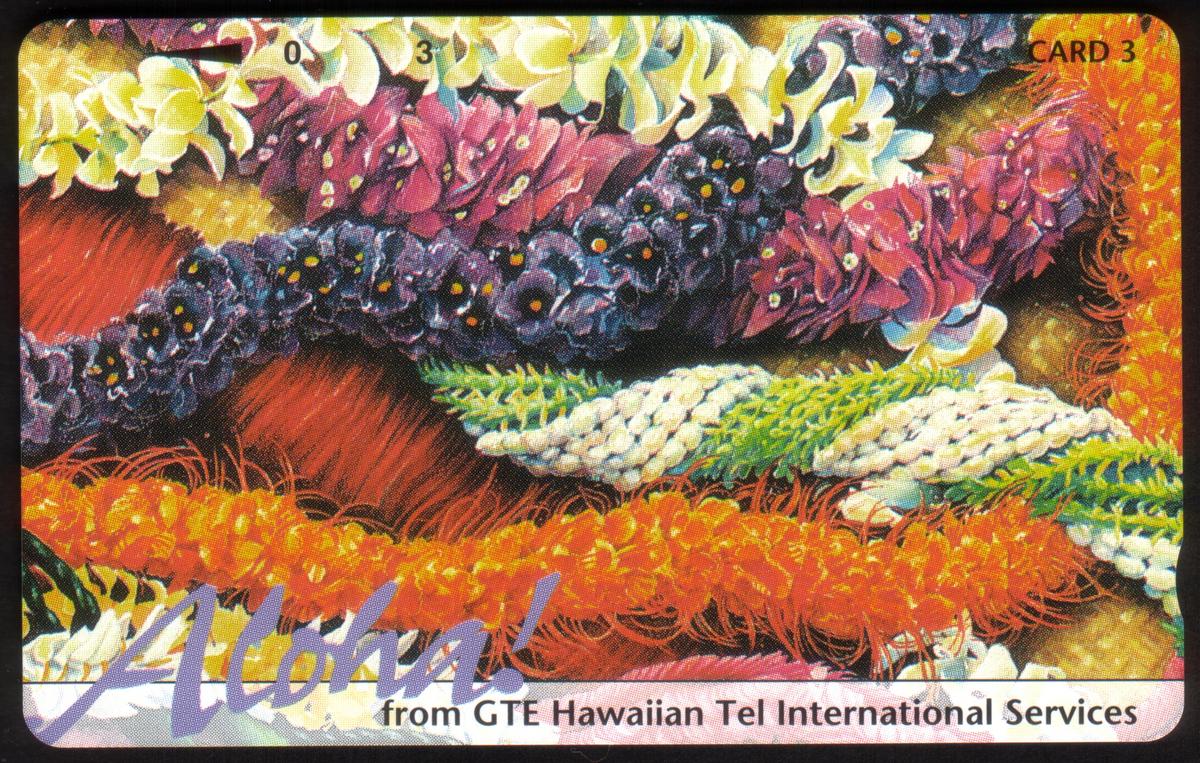In the upper right corner, the card features the logo and name "GTE Hawaiian Telephone," indicating the card’s issuing telephone company. The overall color palette includes a mix of bold, tropical colors with a strong emphasis on purple and other bright tones that complement the leis’ colors. The card design emphasizes Hawaiian culture through these floral garlands and the welcoming message.