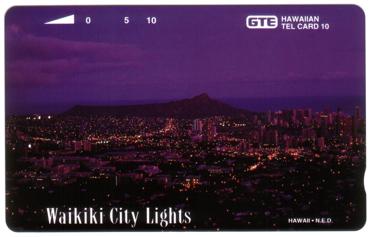 This collectible phone card features a vibrant nighttime skyline of Waikiki, Hawaii. The image showcases the brightly illuminated city lights that stretch along the coastline, highlighting the bustling urban area set against the backdrop of dark mountains. The scene captures the contrast between the glowing buildings and the natural landscape, including both the ocean and hills surrounding Waikiki.