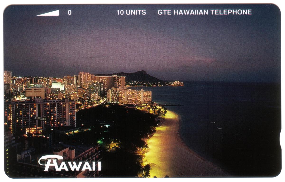At the bottom-left corner of the card, the text "Hawaii" is displayed in bold lettering. The card is branded with "GTE Hawaiian Telephone," indicating its origin and affiliation. The upper section of the card includes the label "10u Coastal Lights," which refers to the card’s value or series related to coastal themes.