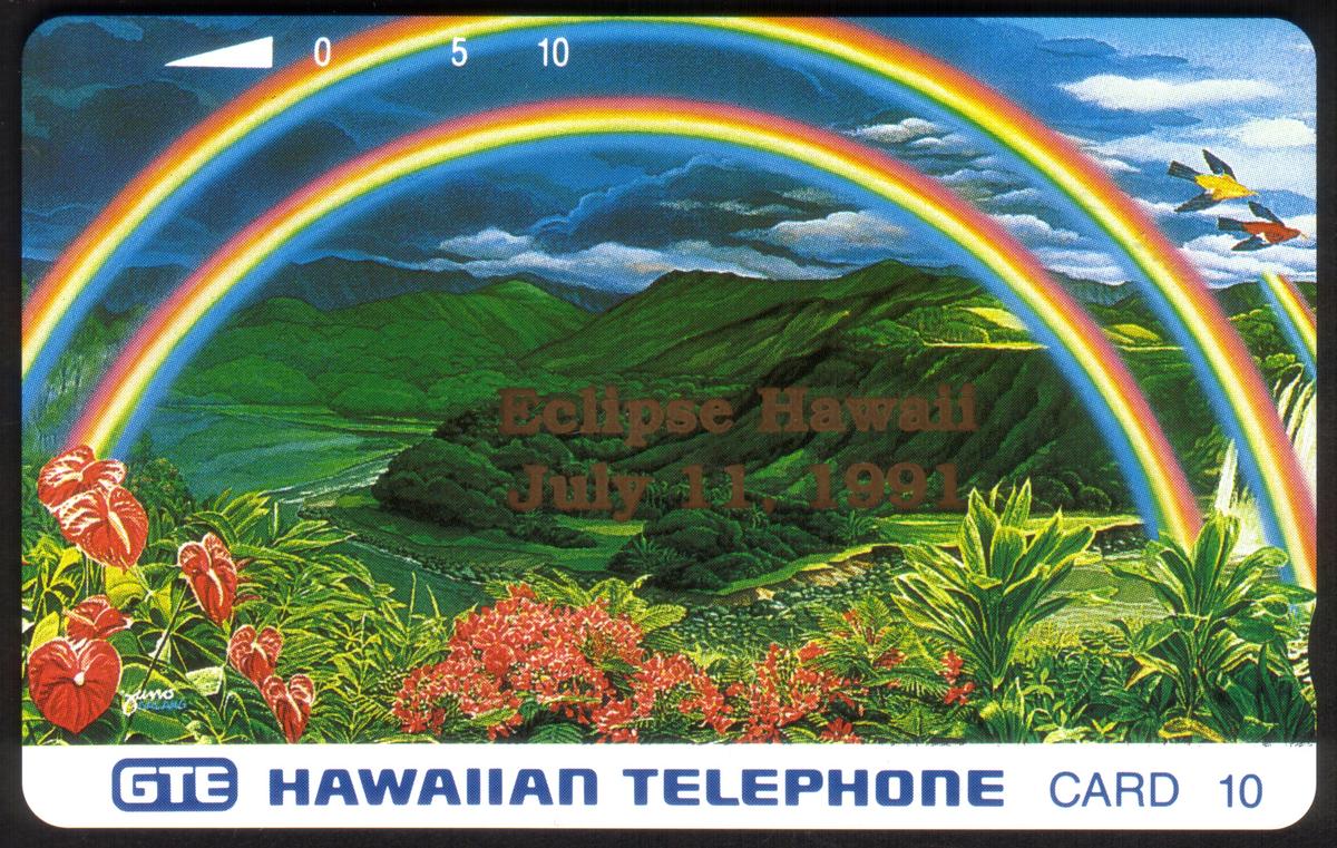 The imagery includes stylized flowers and foliage alongside the celestial event, creating a connection between nature and the extraordinary solar eclipse. The harmonious blend of vivid colors and tropical elements reinforces the card’s theme of a unique experience in Hawaii’s Rainbow Valley. This collectible phone card is a tribute to the 1991 solar eclipse event, commemorated with colorful and imaginative art.