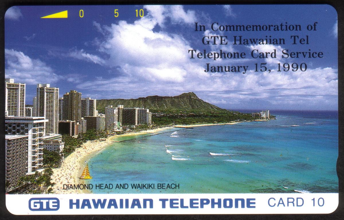 Hawaii-themed phone card featuring Diamond Head, Waikiki Beach, and a 1990 GTE Hawaiian Tel commemorative overprint, with five telephone units. |