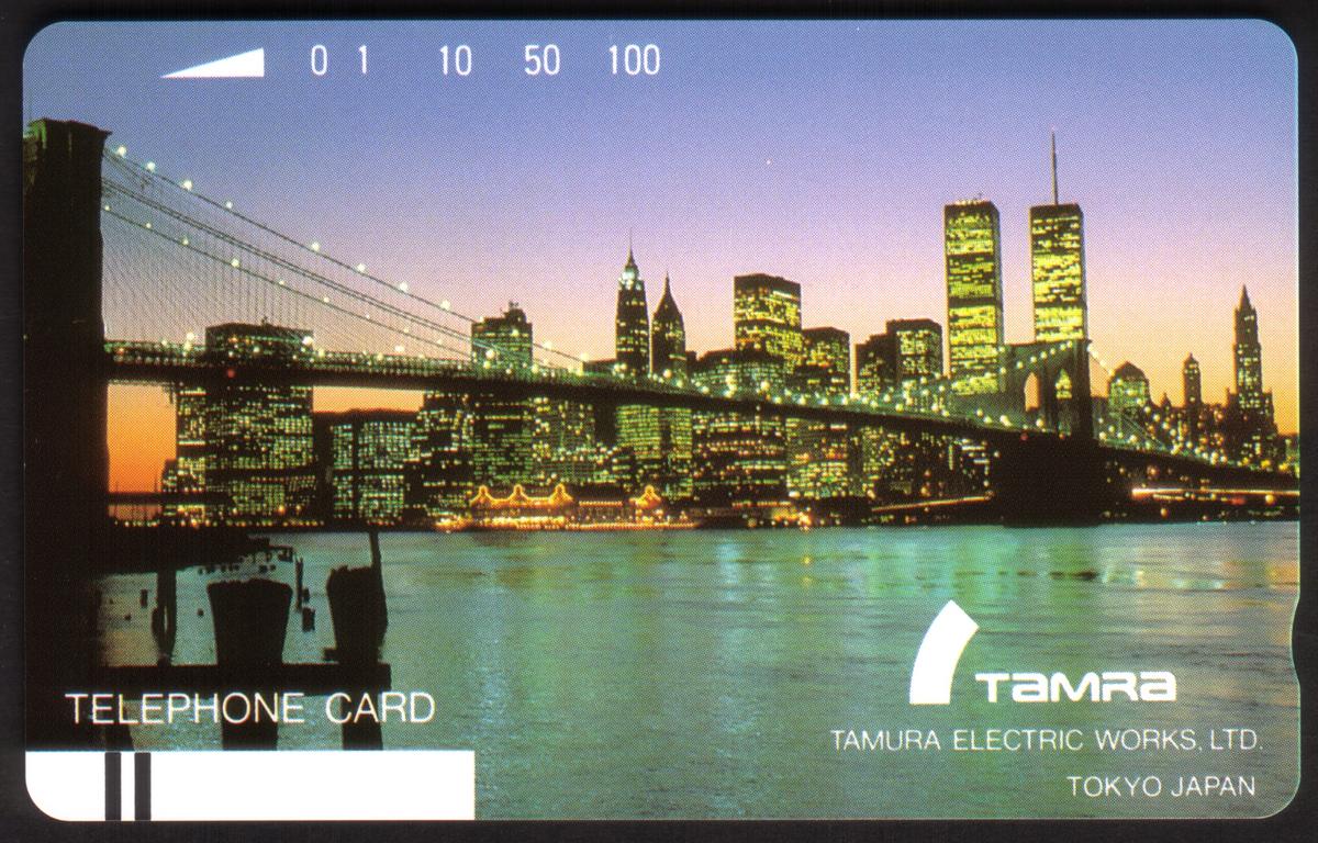 At the top of the card is a charge scale marked with increments 0, 1, 10, 50, and 100, likely indicating units or balance for phone use. The overall design reflects a combination of international corporate branding and a scenic tribute to New York City’s well-known landmarks, specifically focusing on the World Trade Center and Brooklyn Bridge.