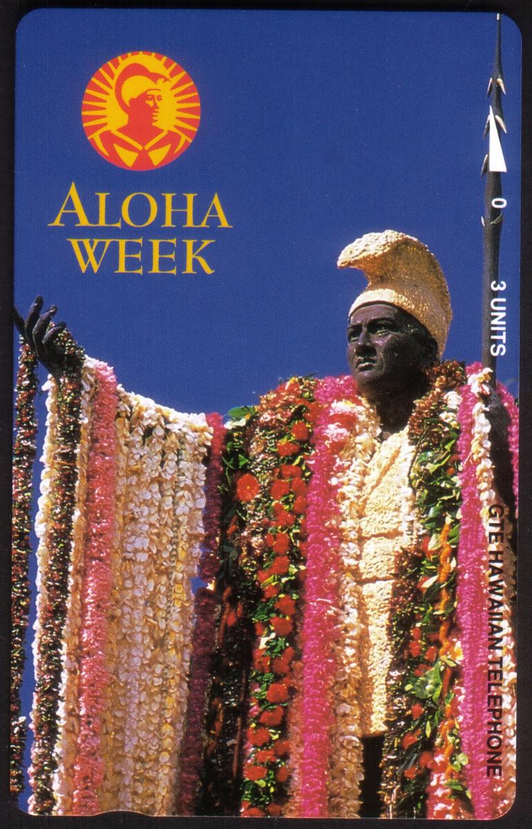 This phone card is a collectible item representing sightseeing and travel in Hawaii, focusing on historical landmarks and statues. It reflects both Hawaiian history through the King Kamehameha Statue and cultural events through the "Aloha Week" celebration, making it valuable for collectors interested in Hawaiian heritage and telecommunications memorabilia.