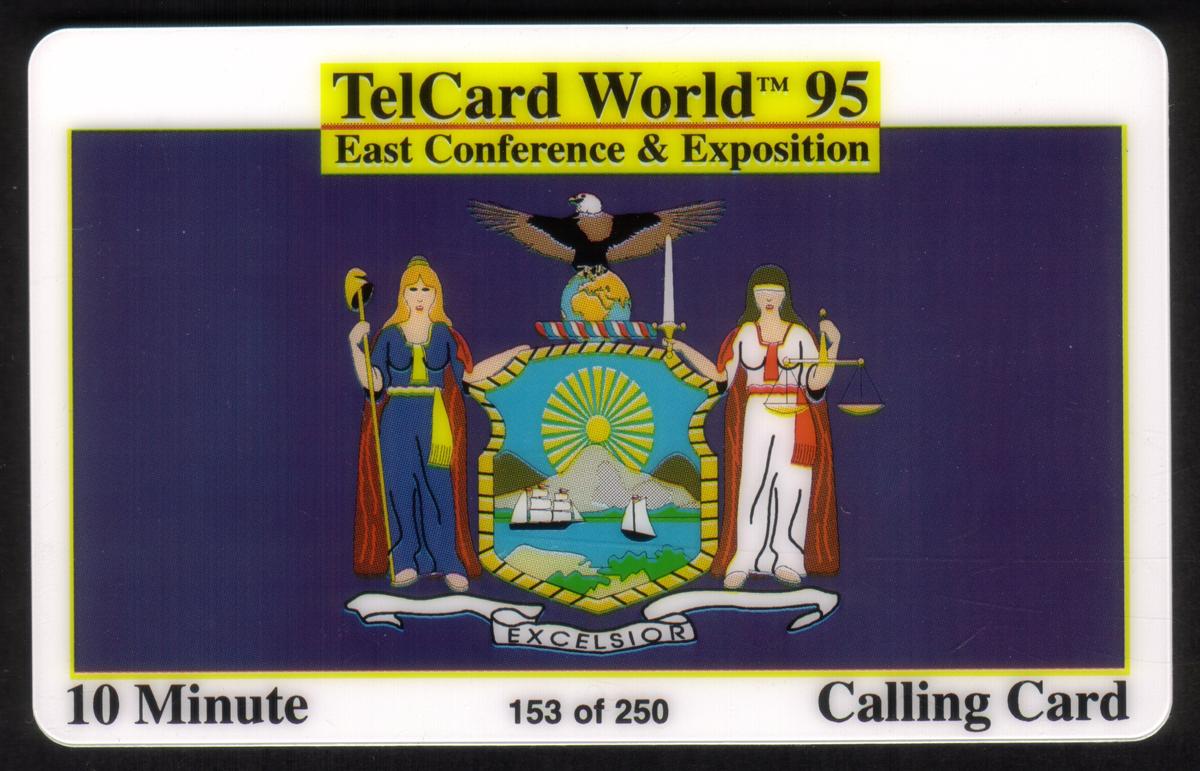 This collectible phone card features a detailed design commemorating TeleCard World '95 East Conference & Exposition held in New York. The card prominently displays an eagle with outstretched wings perched atop a shield, symbolizing strength and vigilance. Behind the eagle and shield, there are two sailing ships with full sails, rendered in a stylized manner. The background includes two globes, representing global communications, placed symmetrically on either side of the shield. Additionally, a sword extends vertically through the center of the shield, adding to the theme of protection and authority.