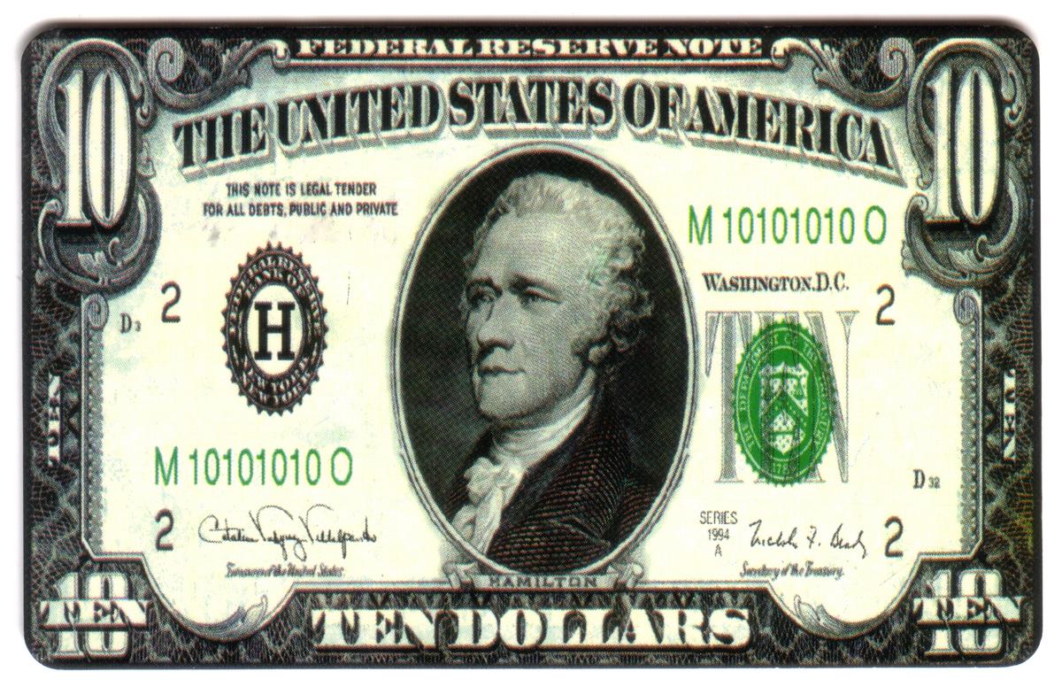 Light reflections and subtle shadows indicate the card’s glossy finish. The colors closely match the real ten-dollar bill, including shades of green, black, and off-white. The exact elements, such as the Treasury seal and serial numbers from the currency, appear with precision, preserving the integrity of the U.S. Federal Reserve’s design. The card stands out as a piece combining U.S. currency iconography with telecommunication branding for collectors and numismatists alike.
