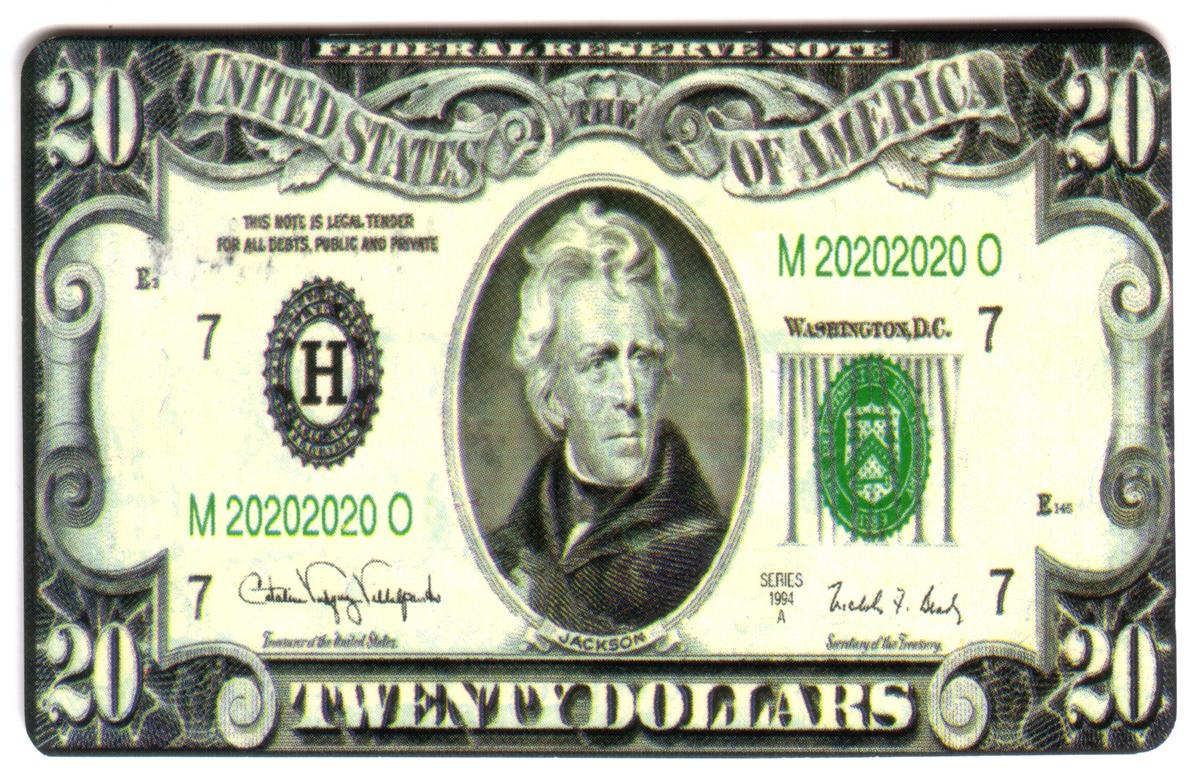 This collectible card features an image of the United States twenty-dollar bill, specifically the modern Federal Reserve currency. The portrait on the bill is Andrew Jackson, the seventh president of the United States. The design of the bill includes typical elements of U.S. currency such as intricate green and black linework, security features embedded within the paper money, and the denomination "$20" displayed clearly.