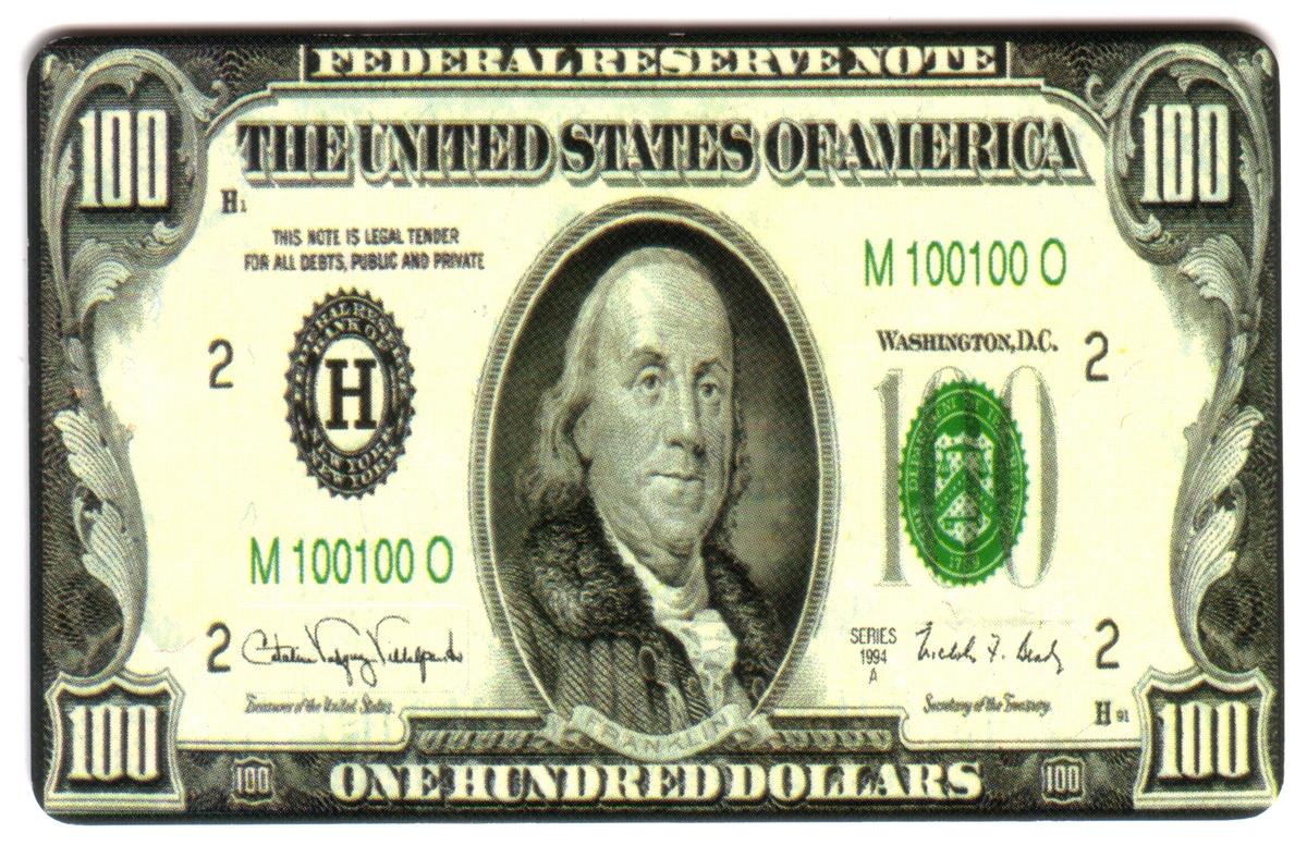 This collectible phone card features an image of a modern United States one hundred dollar bill, prominently displaying the portrait of Benjamin Franklin. The design captures the detailed elements of U.S. Federal Reserve currency, with intricate patterns, numbers, and text consistent with official paper money. The denomination "$100" is clearly visible in multiple locations on the card, emphasizing the bill’s value.
