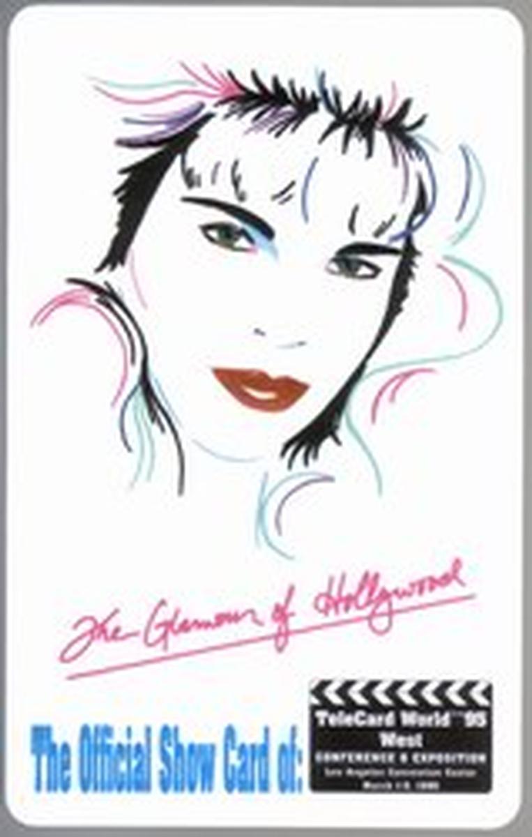 This collectible phone card features artwork related to the 3m Telecard World '95 West event held in Los Angeles, California, in March 1995. Prominently displayed is an artistic outline of a woman, rendered in a stylized form with clean lines and a modern design aesthetic. The card highlights “The Glamour of Hollywood,” tying it to the entertainment industry's iconic image in Los Angeles, the heart of the film and media world.