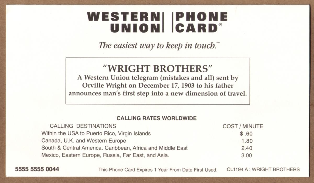 The card has a face value of $5, shown in large white numbers on the lower left corner. The text "WESTERN UNION" and "PHONE CARD" appear at the top of the card in bold black lettering. This card commemorates the landmark achievement of powered flight by the Wright brothers and includes important historical text directly from the era.
