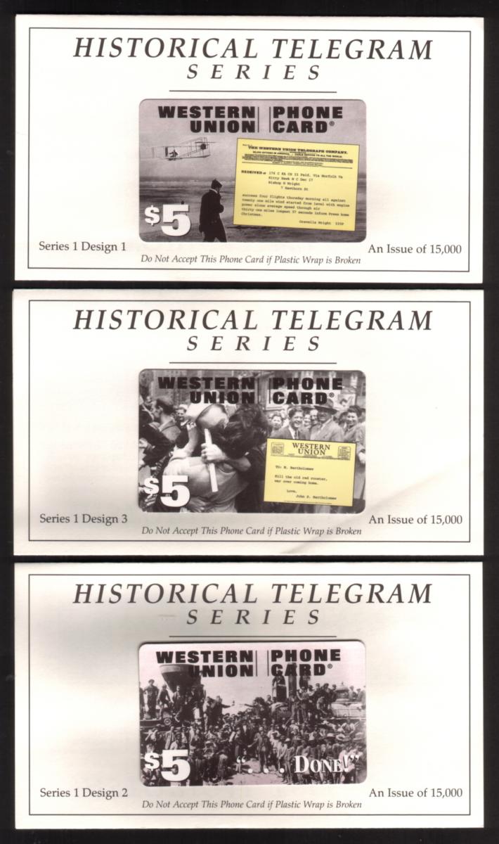 These three Western Union Phone Cards, each with a $5 value, form a collectible set themed around historic moments involving Western Union telegrams. The cards feature black and white photographs enhanced with yellow telegram inserts displaying notable messages related to each scene.