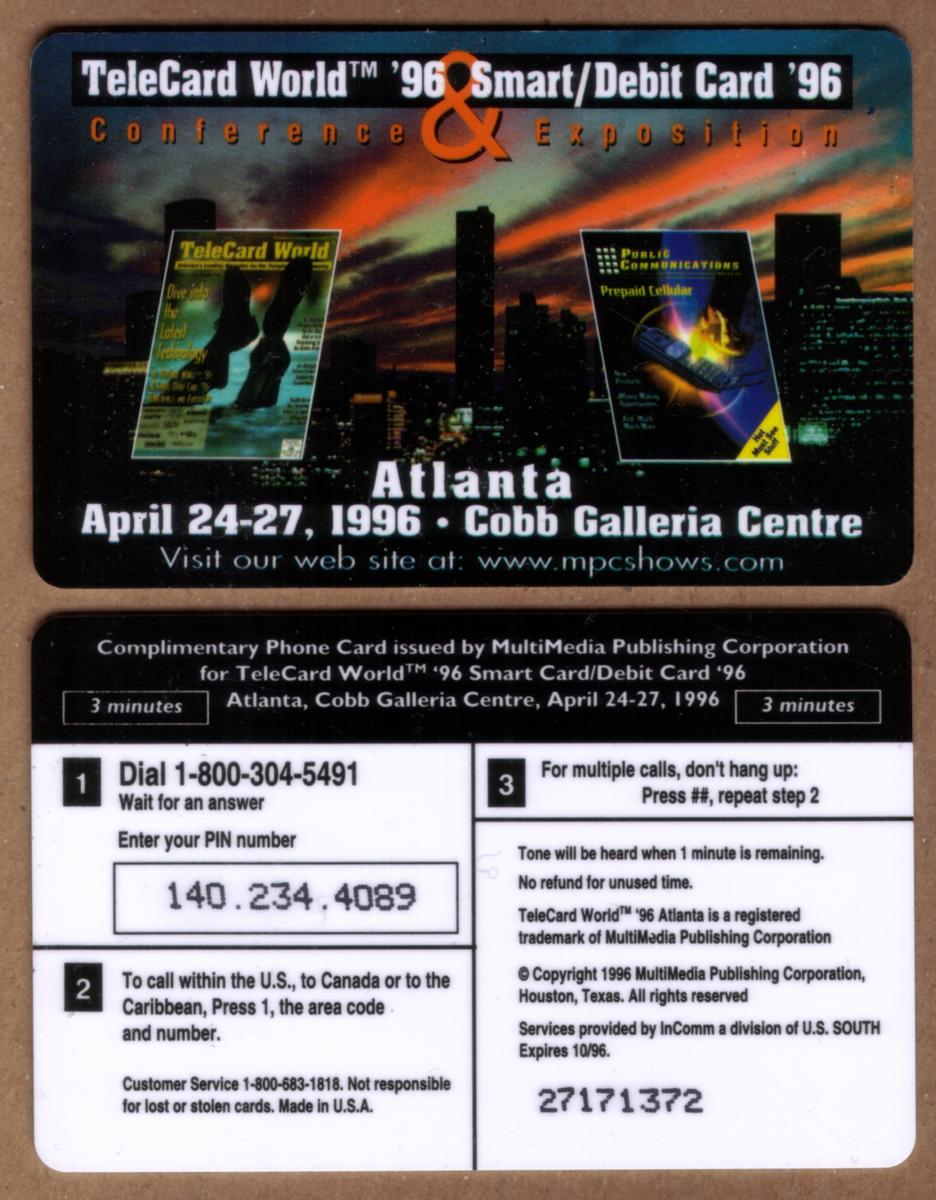 The text on the card includes “TeleCard World 1996” and “3M TeleCard World '96 & Smart/Debit Card ’96 Expo,” indicating its issuance related to a 1996 event centered around telecommunication cards and smart/debit card technology. The card also includes the phrase “April 1996,” which aligns with the timing of the expo. The branding “Incomm” appears as well, representing the card’s affiliation with a payment and prepaid card processing company.