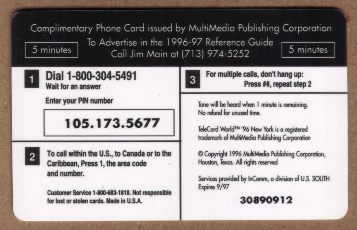 Keywords: phone card journal, telecard trade magazine, multimedia publishing, us south, u.s. south, show cards, telecard world '96 new york, sightseeing, new york city, telecard world 1996 new york conference & exposition, show card, promo, incomm, MultiMedia Publishing