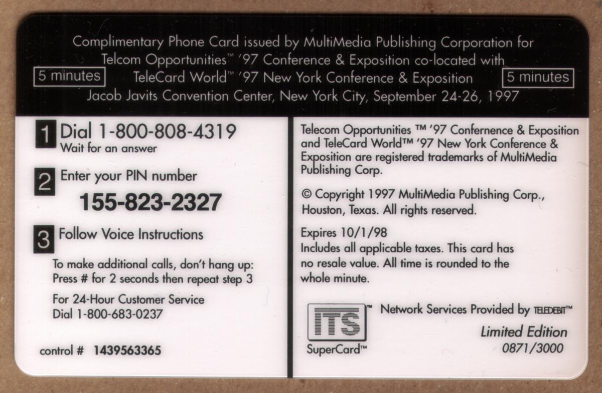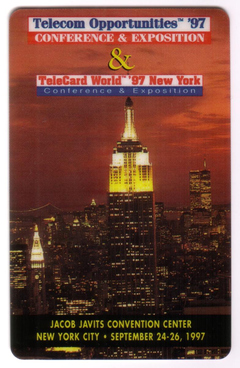 The card commemorates the Telecom Opportunities '97 Conference & Exposition combined with TeleCard World '97 New York Conference & Exposition. The event took place at the Jacob Javits Convention Center in New York City from September 24 to 26, 1997. The card includes text in several areas, with the event titles displayed prominently near the top, and the location and dates printed in yellow text near the bottom.