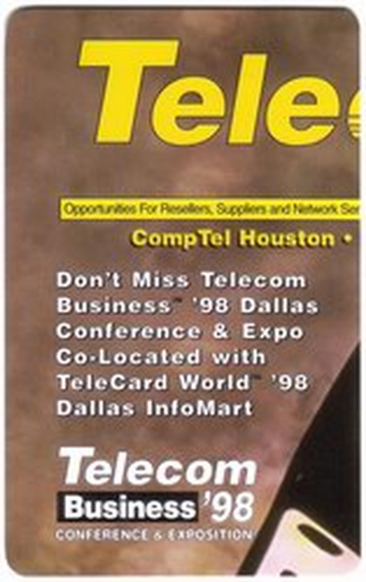 This collectible phone card is issued for the CompTel 1998 Telecom Business conference held in Houston. The card features a vibrant design combining telecommunications imagery and branding elements linked to the event. Prominently displayed is the phrase "Telecard Events," highlighting its connection to telecom shows, expos, and conferences. The layout includes the mention of "Telecom Business 1998," situating the card firmly in the context of that year’s event.