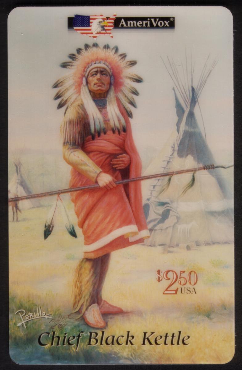 This collectible card features a detailed painted portrait of Chief Black Kettle, a notable Native American leader affiliated with the Southern Cheyenne tribe. He is depicted standing confidently, wearing a traditional Native American headdress with feathers and dressed in rich cultural attire, including a red robe and moccasins. Chief Black Kettle holds a long spear or staff, emphasizing his leadership and warrior status.
