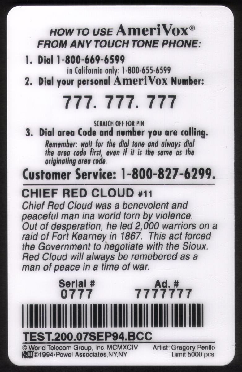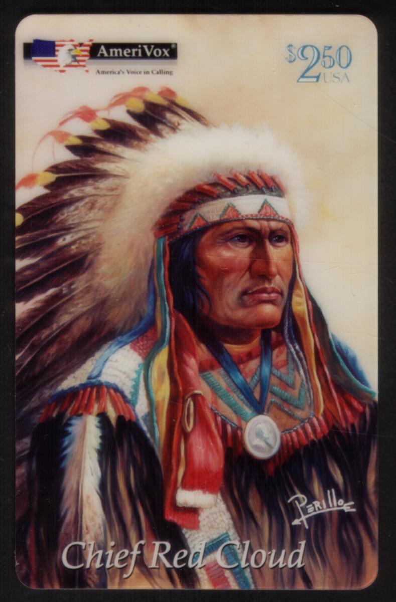 This phone card reflects a rich blend of Americana and American Indian culture, specifically honoring the Lakota Sioux leader. It captures the historical and cultural significance of Chief Red Cloud through artistic detail and traditional regalia, making it a collectible item that celebrates American history and Native American heritage.