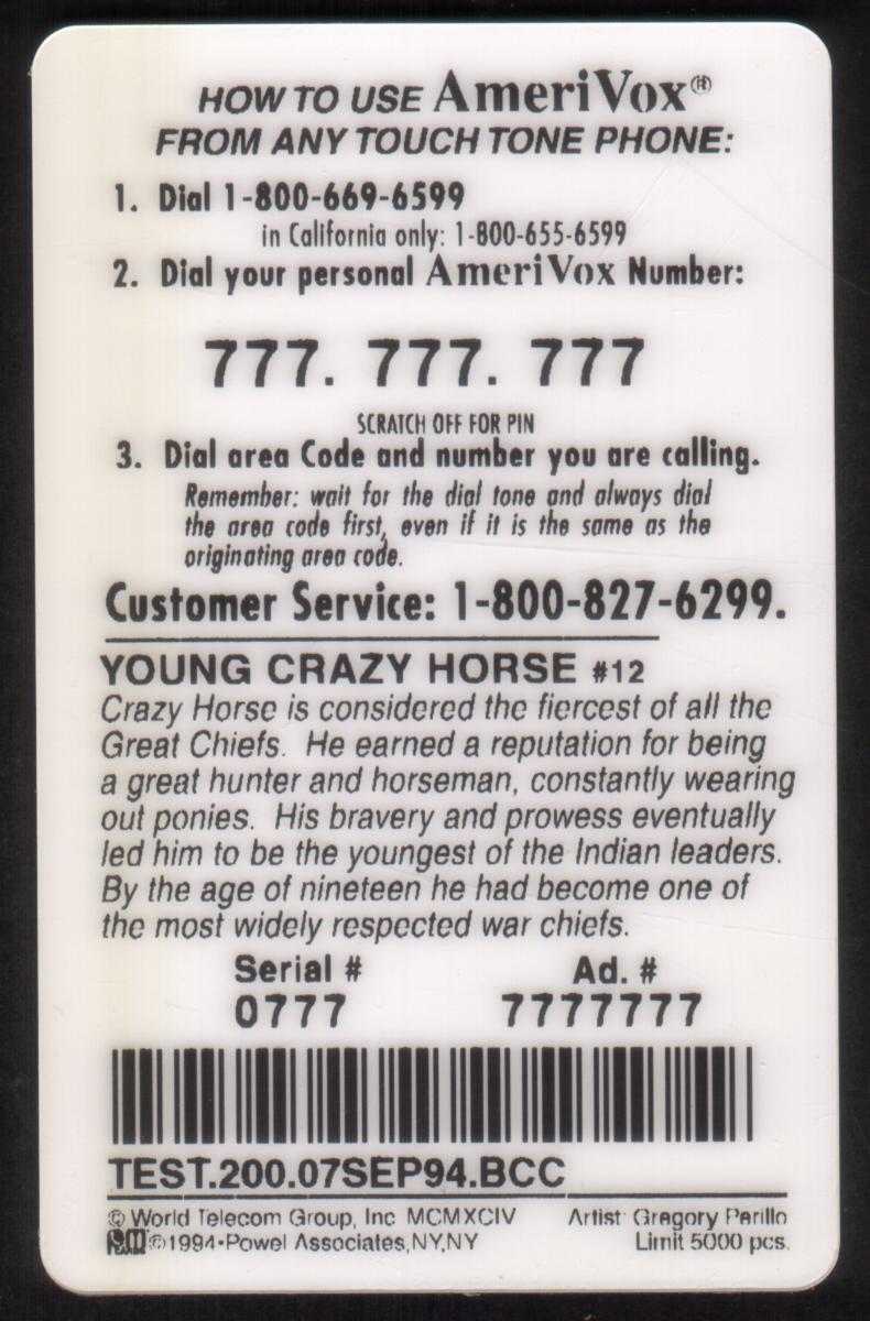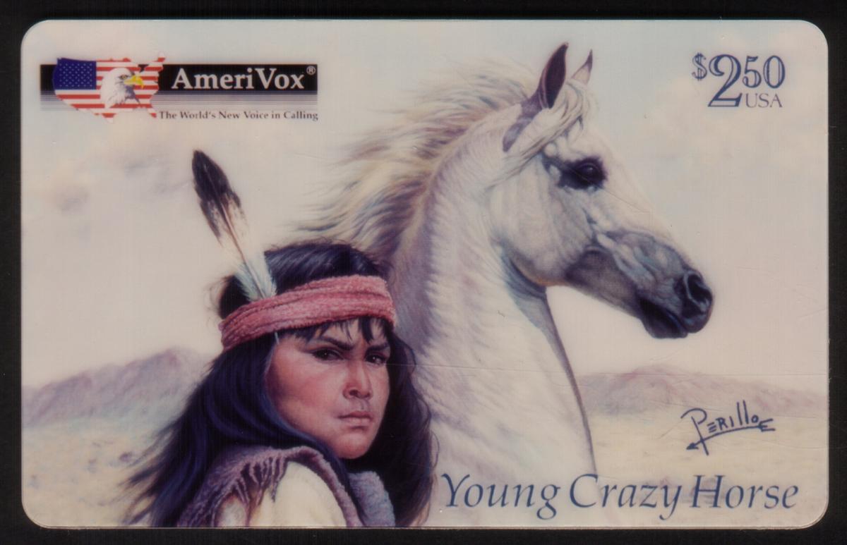 This card embodies themes of American Indians, Native American culture, horses, and American history, specifically referencing the war chief Crazy Horse through the young figure portrayed. It combines artistic style with Americana and cultural representation on a $2.50 collectible phone card issued by AmeriVox.