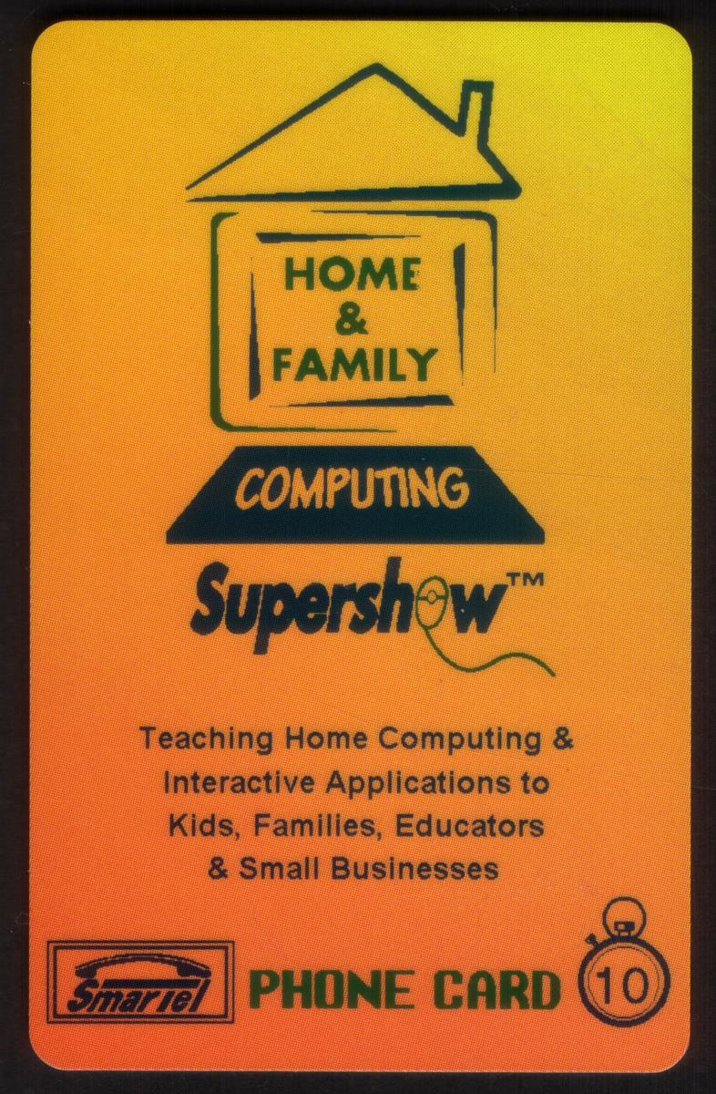 This collectible card is promotional material from the 10m Home & Family Computing Supershow, featuring SmarTel Communication and WorldCom as key entities. The card’s design focuses on computers, technology, and electronics, highlighting themes related to teaching home computing and interactive applications aimed at children, families, educators, and small businesses. The front prominently displays the text "10m Home & Family Computing Supershow," along with logos for SmarTel Communication and WorldCom, emphasizing their involvement in this event centered around technology and communication.
