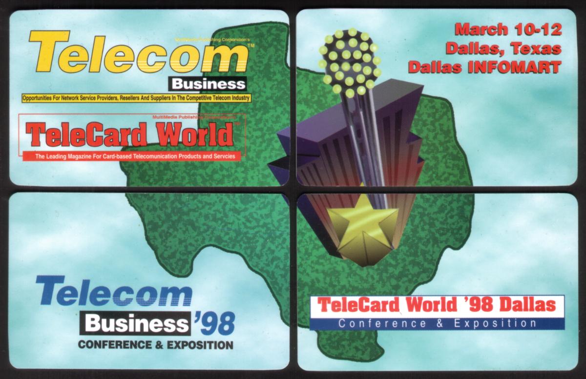 This collectible set features four phone cards from the TeleCard World 1998 Conference & Exposition held at the Dallas Infomart. Each card highlights a distinct theme from the telecom business event in 1998, including references to TeleCard Events, Telecom Business ’98, and associated companies such as PTT Telecom, Homisco, and Voicenet 3M. The cards are part of a puzzle set released by MultiMedia Publishing, commemorating the Telecom Business ’98 Expo.