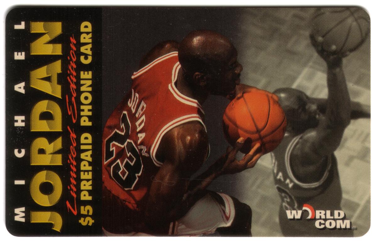 This card is clearly branded with basketball and NBA themes, emphasizing Michael Jordan’s iconic status as a basketball player and celebrity. The card is a limited edition release intended for prepaid telecommunications use with a value of five dollars.