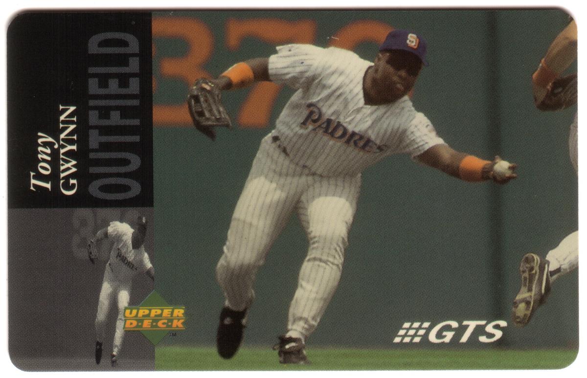 This collectible card features Tony Gwynn, a renowned baseball player, depicted swinging a bat in an outfield setting. The card is associated with Major League Baseball (MLB) and specifically highlights the San Diego Padres, the team Gwynn played for during his career. The design includes the Upper Deck logo, indicating it is part of the Upper Deck baseball card series.
