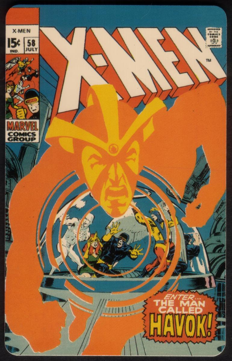 This collectible phone card features artwork from Marvel’s X-Men comic book series. The card prominently displays Havok, a well-known character from the X-Men universe, who is depicted in his classic costume. Havok is shown emitting powerful energy blasts from his hands, which are visually represented by bright, glowing light effects. The background consists of dynamic comic-style illustrations with action lines and bold colors emphasizing the superhero theme.