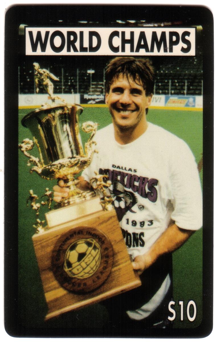 This collectible phone card features Antonio Carlos Pecorari, known as Tatu the Fantastic One, a renowned soccer player and coach from Marinique, Brazil. The card highlights his achievements with the Dallas Sidekicks soccer team based in Dallas, Texas. It prominently displays Tatu holding a trophy, commemorating the 1993 World Championship in soccer.