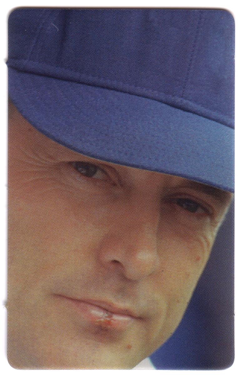 This collectible card features a closeup photographic image of Nolan Ryan’s face, focusing on his intense expression. Nolan Ryan is a legendary baseball pitcher known for his remarkable long-distance pitching ability. His face is prominently centered on the card, showcasing his facial features clearly. The card is numbered as card 5 of 6 in the series.