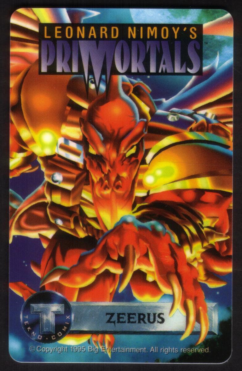 This collectible phone card features artwork from Leonard Nimoy’s Tekno-Comix series "PriMortals: Zeerus," showcasing a character named Zeerus. The image prominently displays a futuristic, armored figure wearing a smooth, helmeted suit without any visible numbers or markings on the helmet. The character is depicted in an action pose, holding a high-tech weapon emitting energy or light, emphasizing a techno-comic, superhero style. The background is dark with subtle, glowing technological elements that complement the sci-fi theme of the Teknoverse.