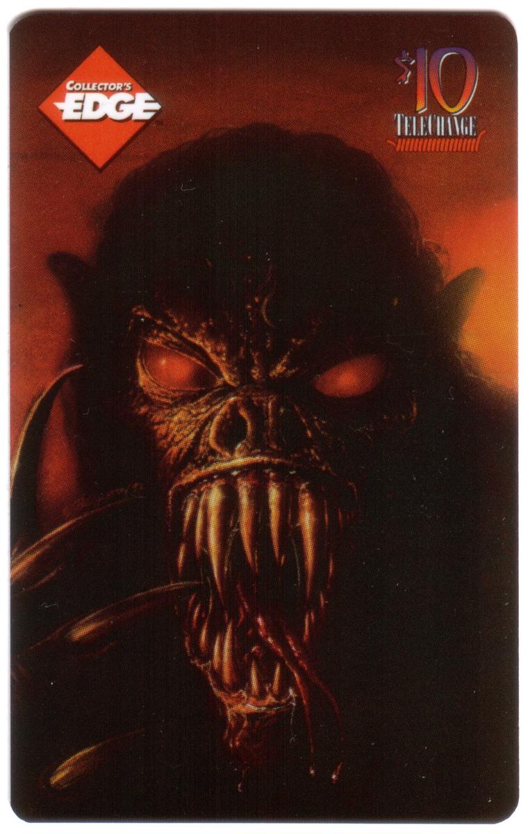 This collectible phone card features vivid artwork of a monstrous vampire's face dominating the entire card. The creature has glowing red eyes and a mouth full of sharp, elongated fangs, with a long, forked tongue extending outward. The vampire's skin is textured and grotesque, set against a dark, fiery red background that enhances the menacing and supernatural atmosphere of the image.