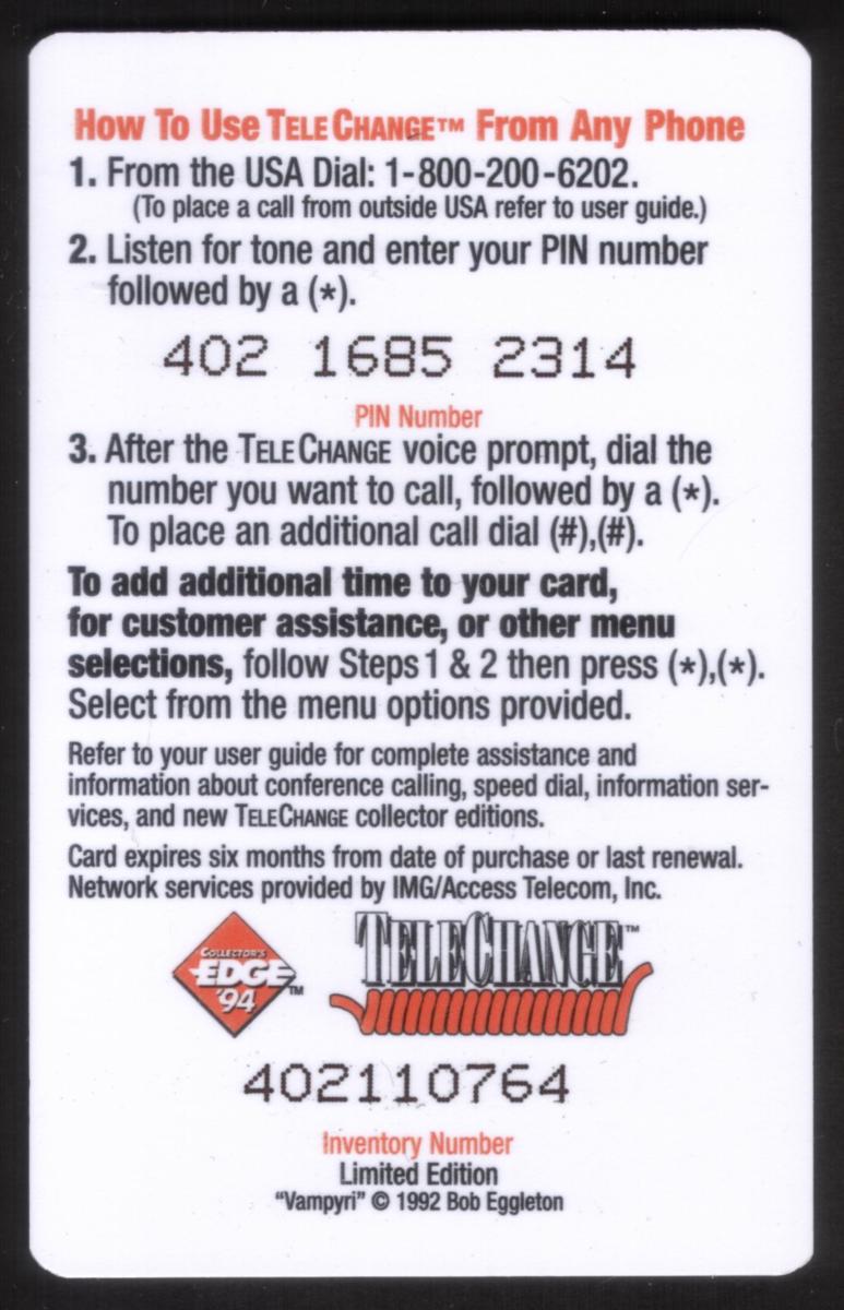 Additional text on the card indicates it is issued by Access Telecom, Inc., aligning with the collectible nature of this phone card from that era and series. The card combines elements of horror, fantasy art, and collectibles, making it a striking piece for fans of vampire-themed artwork and vintage phone cards.