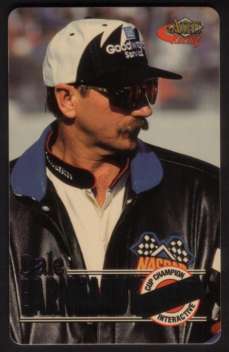 This collectible card features Dale Earnhardt, a prominent figure in NASCAR auto racing. The card highlights Earnhardt as a Cup Champion, showcasing his association with racing automobiles and corporate sponsorships. Prominently displayed is the Goodwrench logo, a brand closely linked to Earnhardt’s racing career. The card is labeled as Card #1 of 20 in the Champion Assets Racing 1996 series, produced by The Score Board Inc.
