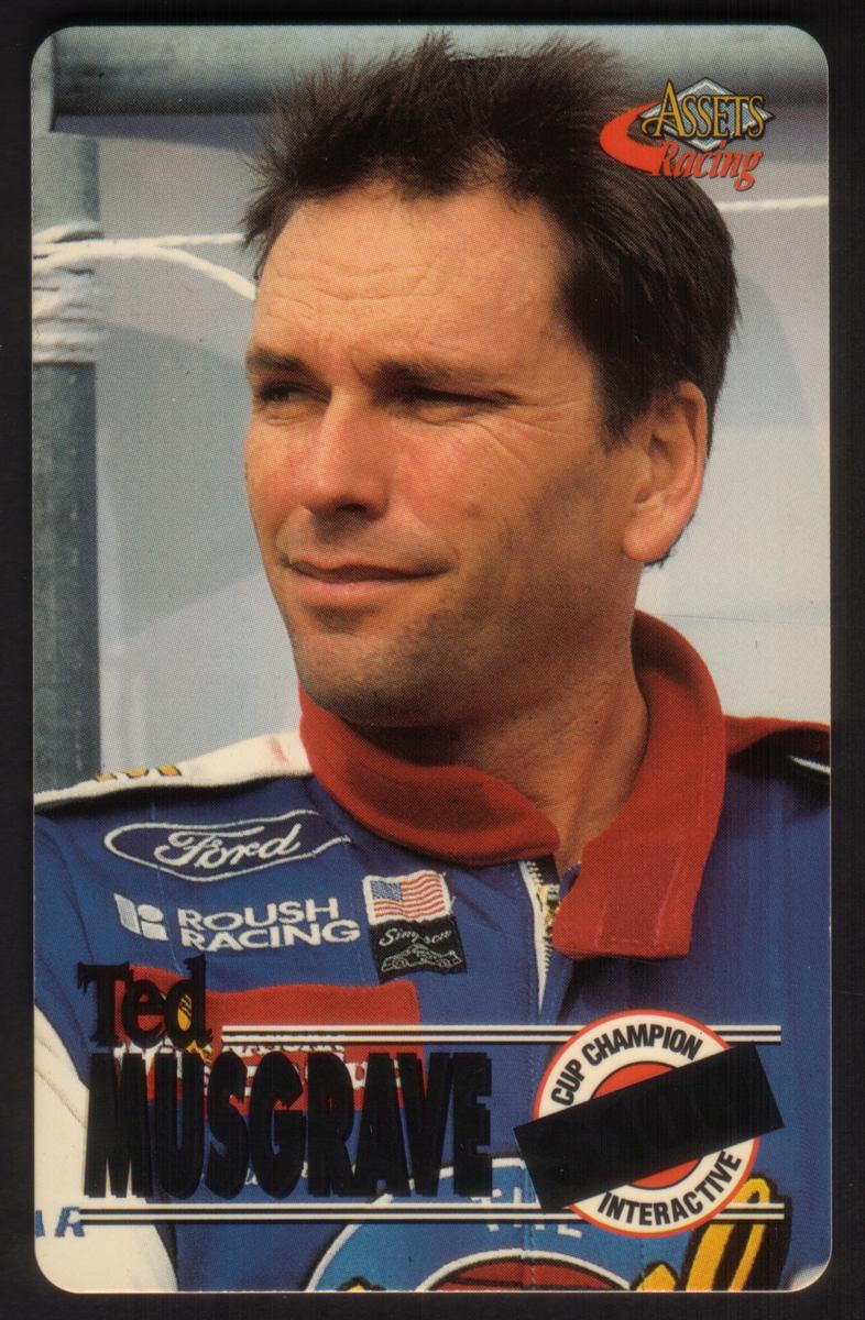 This collectible card features Ted Musgrave, a professional NASCAR driver, prominently displayed in racing gear. The card is numbered 13 out of a set of 20 issued by Champion Assets Racing in 1996. The design includes the logos and trademarks of Roush Racing and Ford, both notable brands in the auto racing industry. The automotive theme is clear with references to cars, cup racing, and championship achievements printed on the front.