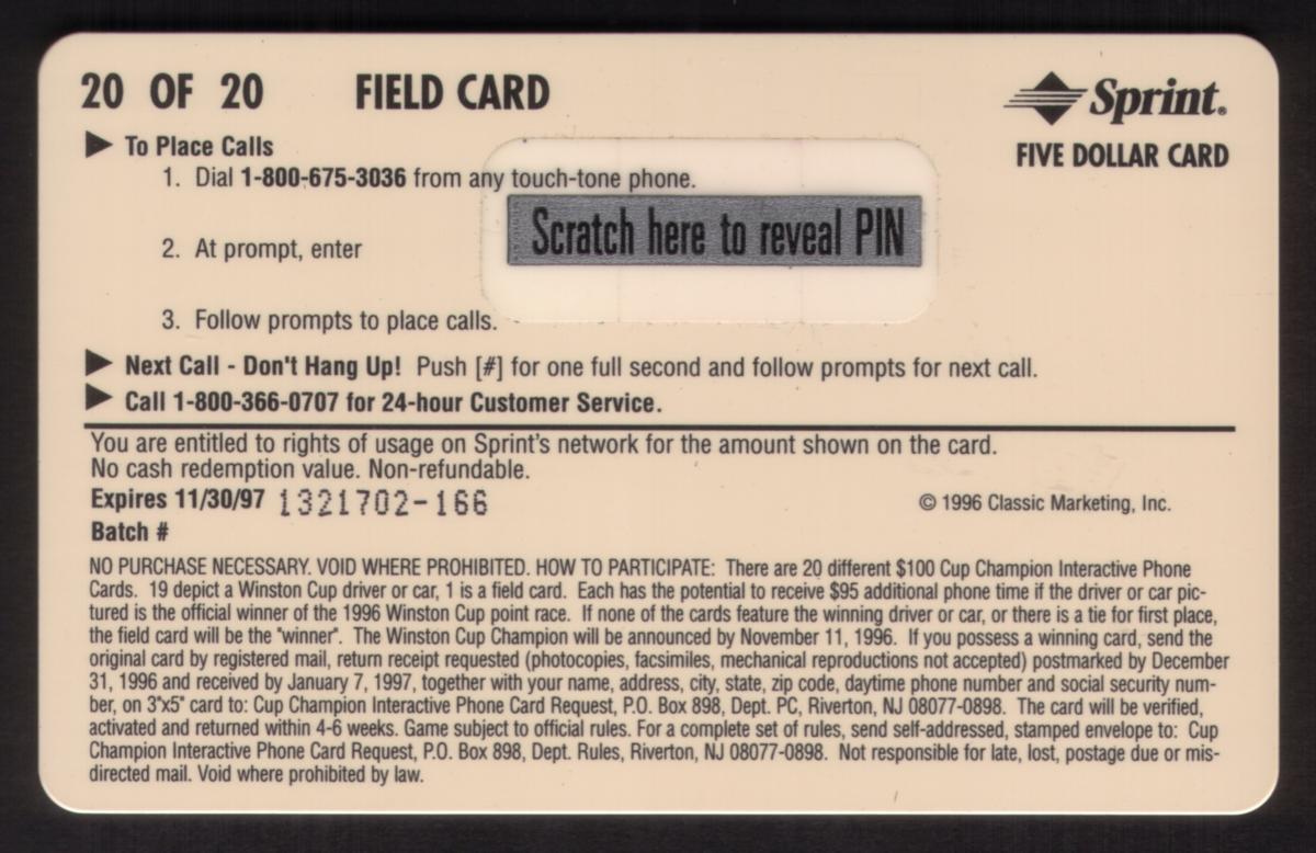 | $100. ($5) Field Card (Card #20 of 20) Champion Assets Racing 1996 |