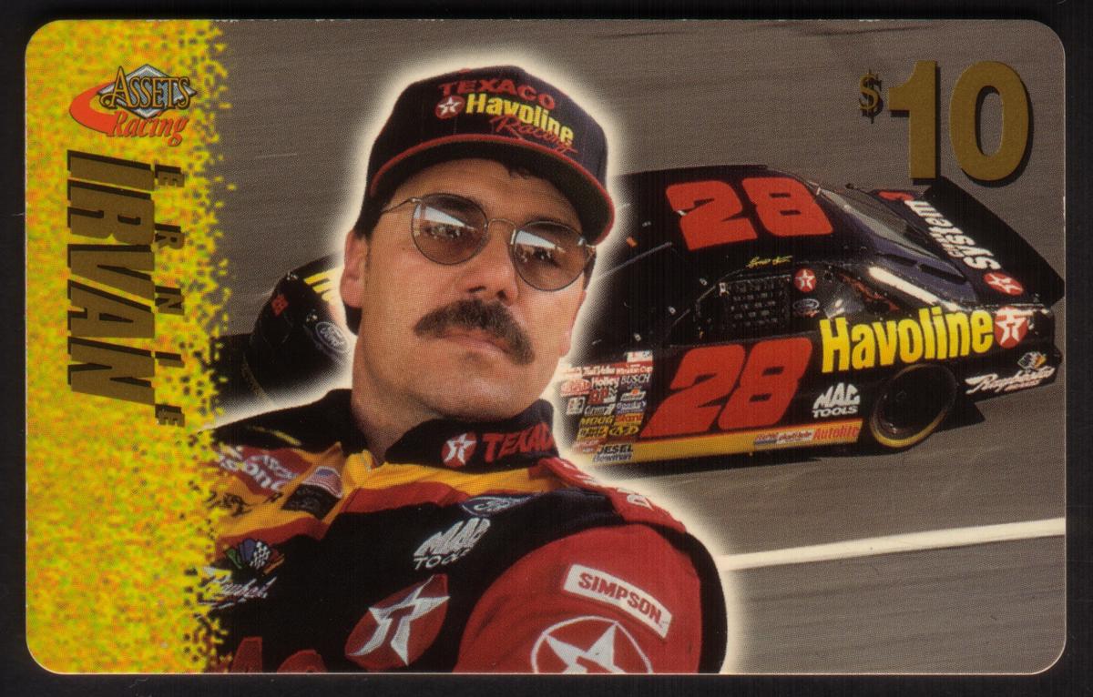 This collectible phone card features Ernie Irvan, a NASCAR driver, prominently in the foreground. Irvan is shown wearing a racing suit and a black cap, both branded with the Texaco Havoline logo in red and yellow. He sports sunglasses and a mustache. The suit displays several automotive-related sponsor logos, including Texaco, Havoline, Simpson, and Mac Tools.