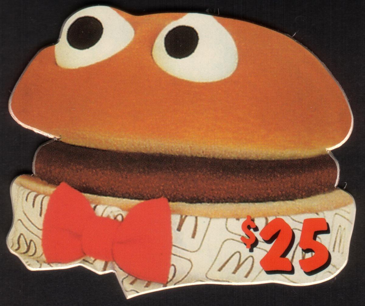 This collectible phone card features a die-cut design shaped like a McDonald's Happy Meal hamburger character from 1996. The character has a large hamburger bun for a head, with two large cartoon eyes on top. It wears a red bow tie over a white napkin that displays the McDonald's "M" logo faintly printed across it. The card's value is prominently shown in red as "$25" on the lower right corner of the napkin.