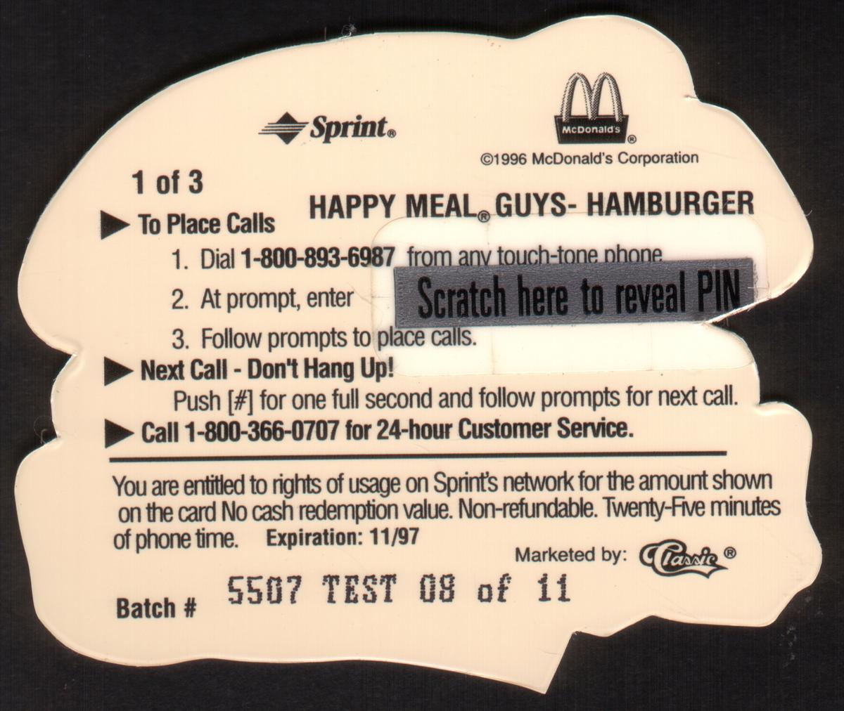 This phone card is one of a series from McDonald's 1996 lineup, specifically labeled as "Happy Meal Hamburger (#1 of 3)" and is part of a test Score Board (Classic) collection. It combines themes of McDonald's fast food restaurants, hamburgers, and logos into a collectible item valued at $25.