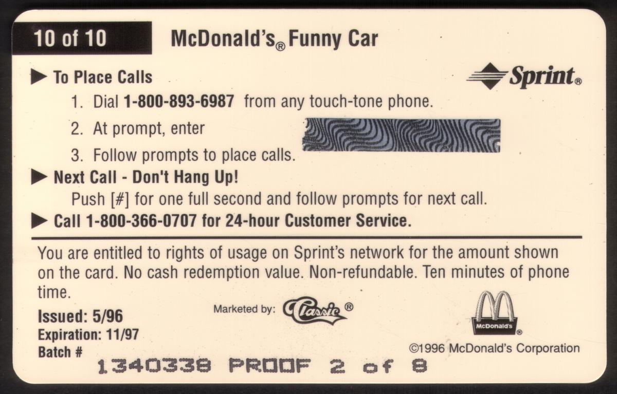This card is one of ten in the McDonald’s 1996 Funny Car series, numbered 10 of 10, and is marked as a Racing PROOF/8 with the Score Board (Classic) designation. It represents a collectible item specifically tied to McDonald’s sponsorship in professional auto racing during the mid-1990s.