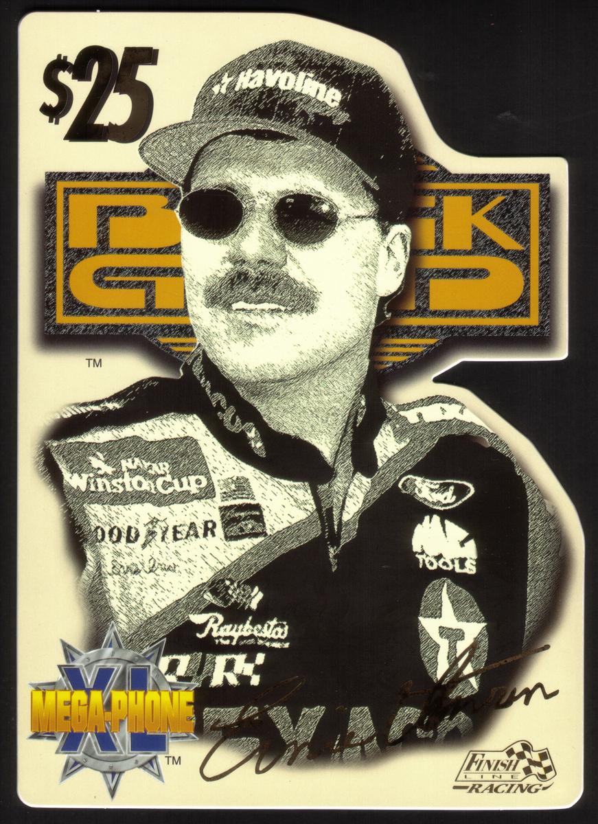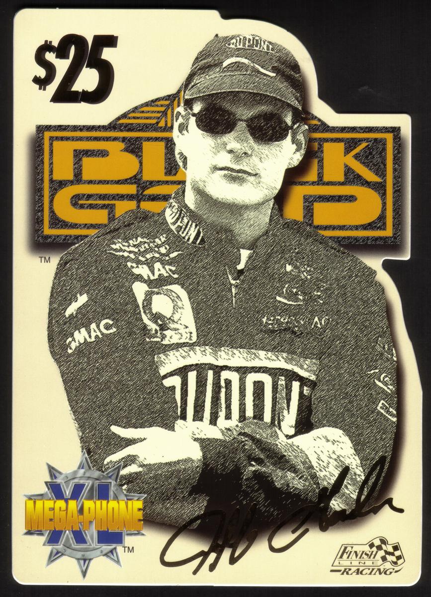 These collectible phone cards each have a value of $25 and belong to the Black Gold series from Finish Line Racing. Each card features a detailed, stylized black and white portrait of a prominent NASCAR driver, presented in a die-cut shape that outlines the figure.